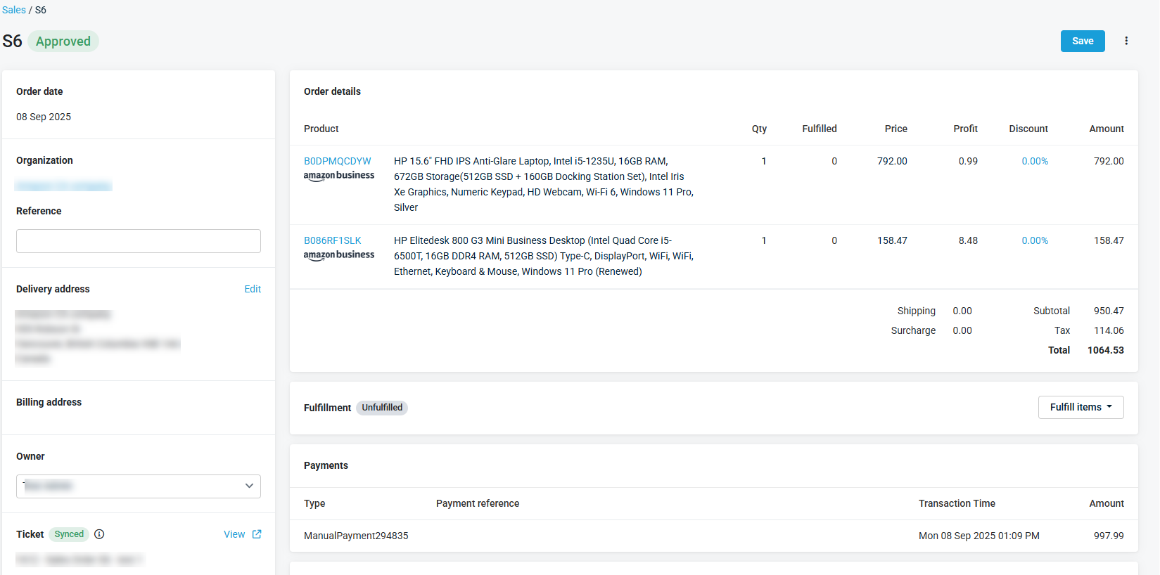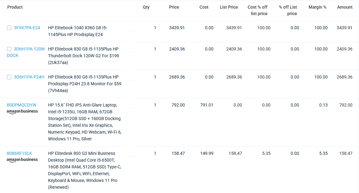 If the price of an Amazon product is lowered in the quote, the sales order reflects the discounted price, but the purchase order uses Amazon’s actual price (effectively offering a discount to the client).
