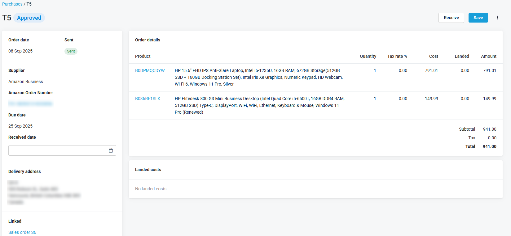 Tracking information from Amazon is automatically populated in the purchase order when the order is received.
