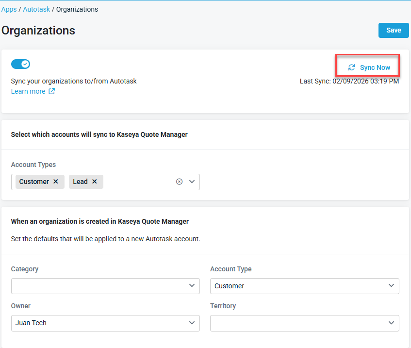 On the Organizations sync configuration page, you enable the two-way organizations sync between Autotask and Kaseya Quote Manager and configure the filters that determine which organization accounts are transferred from one application to the other. Company details and contacts are copied to and from Autotask and Kaseya Quote Manager. Once added to Kaseya Quote Manager, organizations can be accessed and managed from your Organizations landing page.