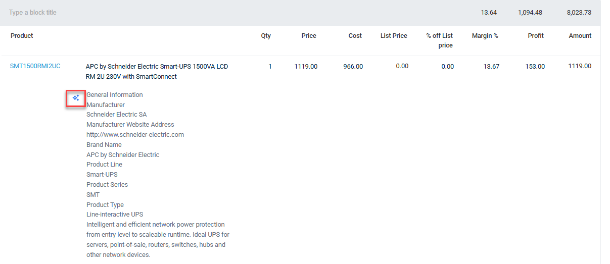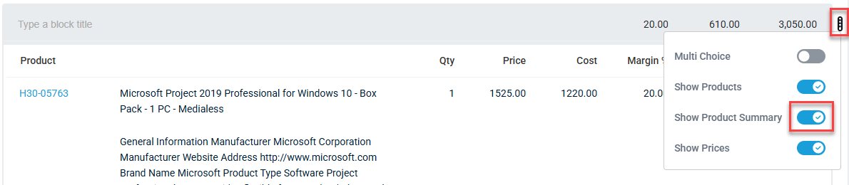 - Click the plus + icon wherever you would like to place the product block in the quote.